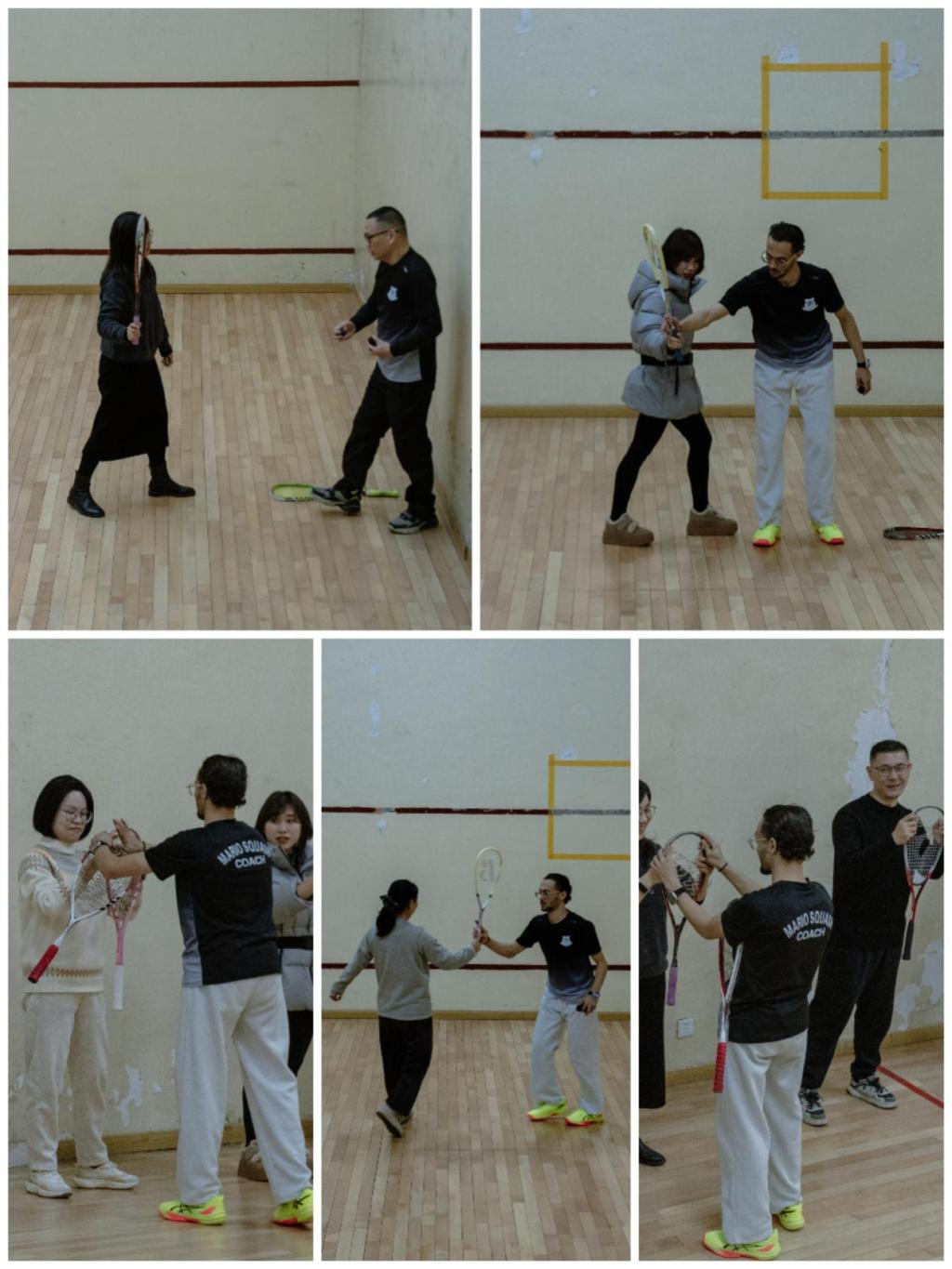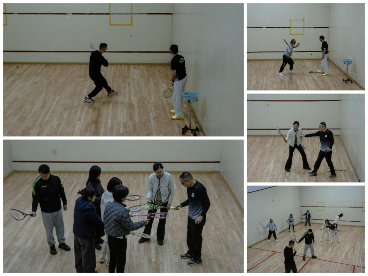 培训前,教练团队详细讲解了壁球运动的基本规则,以及握拍、击球、移动等核心技巧,通过生动地示范和耐心地讲解,帮助教职工快速建立对壁球运动的认知。教练根据教职工的运动基础差异,采用 “分组教学和一对一指导”的模式,循序渐进开展训练。从基础的握拍姿势矫正,到简单的击球练习,再到模拟对抗中的步法移动。虽然很多老师是首次接触壁球,但在教练的专业指导下,逐渐找到了运动节奏,感受着壁球运动的独特魅力。