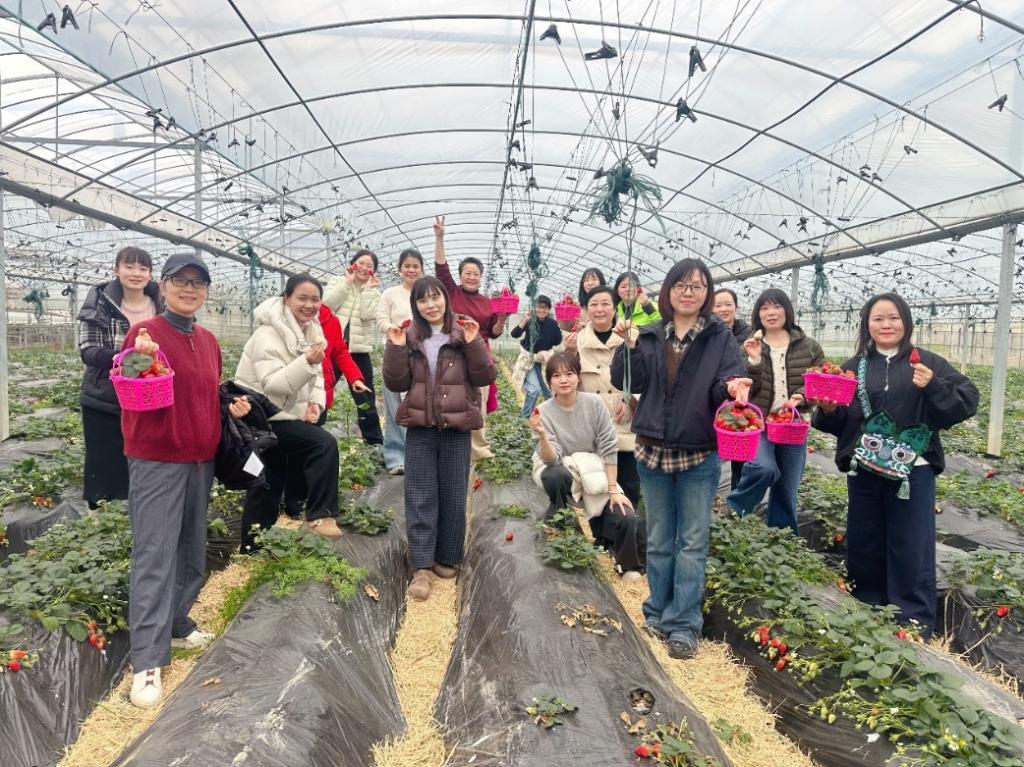 午餐后,女教职工们满怀期待抵达金辉果蔬博儒桥基地。作为本地现代化农业标杆,基地的空中草莓栽培区与物联网水肥一体化系统令人耳目一新。在工作人员引导下,大家了解了章姬、建德红等优质草莓品种的特性,以及科学采摘与安全须知,随后有序进入温室大棚开启采摘之旅。